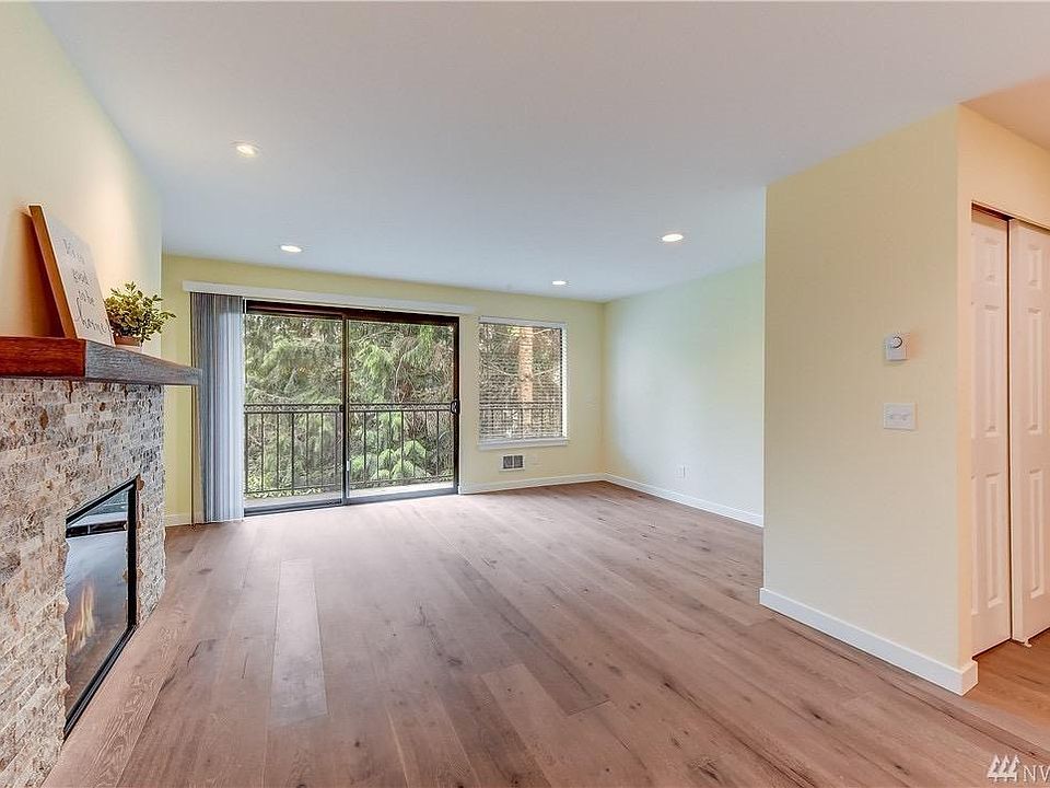A gem in Greenwood! A condo, fully remodeled to the studs, in a great neighborhood. 2 beautiful newly carpeted bedrooms and 2 modern tiled bathrooms with storage and an assigned parking space. The bright floorplan features wide planked hardwood floors, new kitchen, new premium stainless steel appliances (not pictured), quartz counters, custom tile, contemporary lighting, oversized rock fireplace with wood mantle, washer & dryer, and master with private bathroom. A wall mounted 65" OLED TV and a 52" plasma TV in the master bedroom and living room, respectively, would be included in the rental. The TVs and any additional furnishing, if desired, would be included if agreed. The large deck faces a greenbelt on the quiet sunny side of the building that gives a rural feeling. Sauna and gym located on the 1st floor included. Storage on 2nd floor included. Assigned guest parking spaces outside of building and street parking for guest available. Close to I-5 and Hwy 99, bus route on Greenwood, Northgate Transit Center, shops, and restaurants in Ballard, Wallingford, Shoreline, & Fremont. Deposit, first, & last month of rent required after background and credit check. Background and credit check required for each adult. $2200 monthly No pets or smoking. Please ring #302 on the call box at the front door to inform of your arrival and you will be buzzed in. Thank you. Renter responsible for all utilities, internet, and cable. Last month of rent due at signing. No smoking or pets allowed.