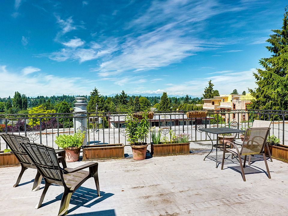 Mountain view 2 bedroom, 2 bathroom, top floor condo in Greenwood! Bright and airy open floorplan with separate living/sleeping area, perfect for roommates or families. Good sized bedrooms with primary ensuite. Recent kitchen and bath updates, fireplace, laundry in unit, hot water heater replaced in 2020, 2 storage lockers and a covered parking spot. Indow windows in bedrooms for added energy efficiency. Rooftop deck, gym area and more! On multiple bus lines for easy commutes downtown or to new light rail. Resident managed building and pet friendly!