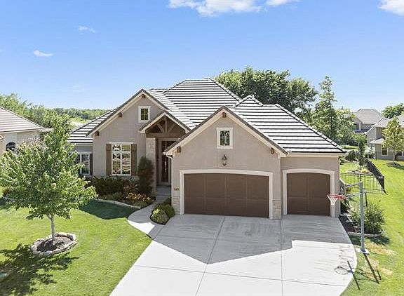 Olathe West or Northwest..YOU CHOOSE!Don Julian Former Brookridge II Model one of a kind in CC by the Park has it all w/ dramatic wood vaulted ceiling w/beams in great room. New carpet on main floor, refinished hardwood floors, New paint throughout. Reverse 1.5 story concept w/3 bedrooms 2.5 baths on the main level. Tile roof, all stucco, aluminum fence, deck overlooking $20K custom patio w/fire pit by Canyon Stone, granite in 4 of 5 baths, 2 private bedroom suites in Lower level.$135K under reproduction cost new