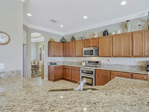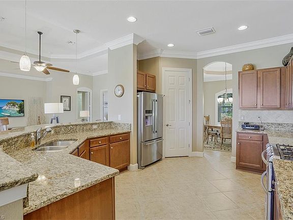LIVE A VACATION LIFESTYLE IN THE QUARRY! Imagine entertaining on the spacious lanai with a water view. This 2 bedroom/Den (that could be made into a 3rd bedroom), 2 bath home is situated on a large lot overlooking a pond. You walk through the front door into an open and bright great room with pocket sliding glass doors leading to the large lanai with a salt water pool with solar heaters. The kitchen has a large eat in area, with GAS COOK TOP, granite counter tops, solid wood cabinets, stainless steel appliance (including a new refrigerator.) Other additions include a formal dining room, crown molding, plantation shutters, custom closet system in the Master Bedroom, tray ceilings, privacy door in master bedroom leading to the pool and upgraded landscaping, The Quarry is a lakefront community offering Boating, Golf, Tennis, Pickleball, Bocce Ball, Tiki Bar, Restaurant, Pool-Side Food/Drink Service, Gym, Social Activities, and more! The Quarry offers a lifestyle like no other, including a beautiful Lake Lodge with a Tiki Bar and over 500 acres of lakes that can handle boats & jet skis. The Quarry offers a Private 18 hole PGA Level Hurdzan Golf Course (Not Mandatory).
