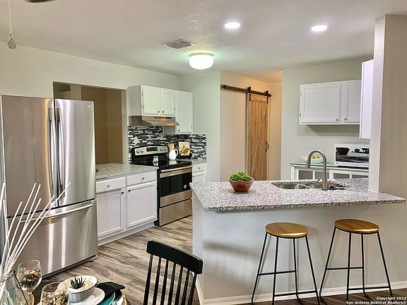 This absolutely gorgeous and fully remodeled one-story home offers 3 large bedrooms, 2 full baths, and a 2-car garage. It is 100% turnkey (move-in ready) for you and your family today!! Boasting brand new luxury plank flooring that extends throughout every room in the home and provides a warm, solid surface for you and your furry friends. The all-new eat-in kitchen includes brand-new granite counters, ss dishwasher, ss range, ss double-sink, brushed nickel faucet, disposal, recessed lighting, and a custom tile backsplash that only compliments this bright and sparkling area. Both bathrooms have lavish custom tile work, brand new vanities, decorative mirrors, lighting, and new brushed nickel fixtures. This incredible home has an exceptionally huge living room with a new wraparound stone fireplace, an office nook, and dual ceiling fans. A brand-new sliding glass door leads out to your covered patio and backyard oasis surrounded by privacy fencing. This is a perfect home for entertaining & BBQs with family and friends amongst the mature shade trees. The enormous double-doored primary bedroom suite has a private full bath with custom tile work, new dual vanities, and two large walk-in closets. The other bedrooms are spacious with new ceiling fans. A new super-efficient HVAC system will keep you cool in the summer and warm in the winter. All interior has new texture on all the walls and ceilings and was repainted top to bottom. The exterior trim and woodwork have been fully repainted. A full lawn irrigation system is included. NO foundation issues!! Sitting on the Universal City line in Converse, this beautiful home won't last. CAUTION: View at your own risk, as you will fall in love immediately. Close to Randolph AFB, shopping, restaurants, and friendly neighbors.