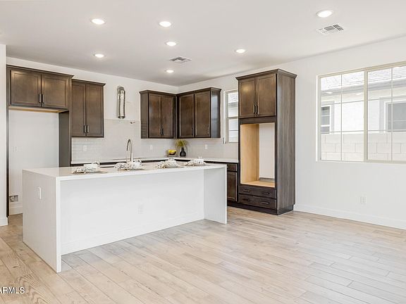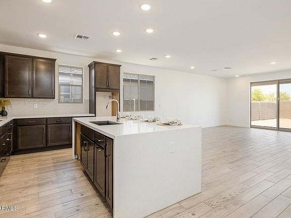 This newly built single-story home is located in Eastmark and offers 4 bedrooms and 3 full bathrooms. The floor plan is popular and includes upgraded gas appliances, a gourmet kitchen layout, and a spacious kitchen that is open to both the dining area and the great room. The maple cabinets come with dovetail drawers and soft closing hinges, as well as cabinet hardware included as a standard feature. Furthermore, the home includes a Jr. Master bedroom suite layout and a standard 3 car across garage, complete with a service door for backyard access. The interior of the home features wood-looking tile throughout, with bedrooms carpeted for added comfort. If you're ready to move in now, this home is available for immediate occupancy.