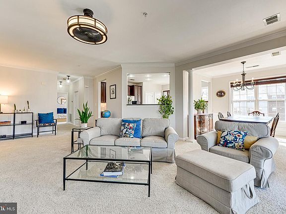 SUN FILLED - top floor corner unit with a garage. Secure building with elevator. Shows beautifully. LARGE open family room. Separate dining room with decorative columns. Crown molding accent the 9' ceilings. Updated designer lighting/fans. Chefs kitchen with center island, newer SS appliances, Corian counters and tile backsplash and floor. Breakfast area and pantry. Designer wood blinds throughout. Primary bedroom with multiple closets. Luxury bath with dual vanity, corner soaking tub and sep shower. Nice size secondary bedroom. Full hall bath. Laundry room with full size units. Large balcony with ample seating. Too much to list it all. Garage is directly in front 2nd to the left of entry door, with direct inside access into building. Community pool, club house, walking trails and close to VRE, restaurants and shopping.