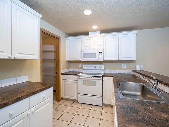 Kitchen has breakfast bar, tile floor, white cabinets, large walk in pantry, appliances provided include; refrigerator, range, dishwasher and built in microwave.