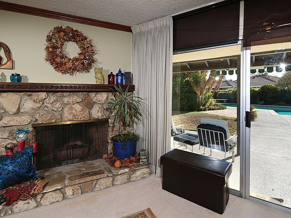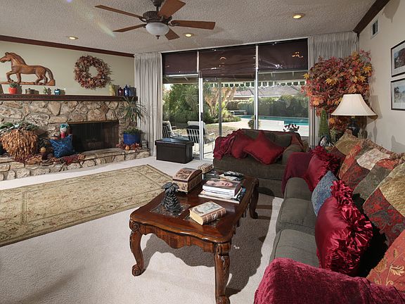 Chateau Highlands Traditional California Ranch home with off the charts curb appeal! Towering trees, lush, lush landscaping, circular driveway. Both the front and backyard are large on one of the biggest lots in this development. Double door entry, security alarm system, hardwood floors in kitchen and bonus room. There are 2 charming extremely custom brick and stone fireplaces, wood beam ceilings and studio guest house. Very large pool in the backyard with mature fruit trees to entertain in style!