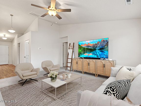 Don't miss this like-new Hayden rancher, built in 2021! This home features 1,416 sq ft of living space, including 3 bedrooms and 2 bathrooms, cathedral ceilings and luxury vinyl wood plank flooring throughout the entry, dining area and kitchen. The kitchen is equipped with 42-inch upper cabinets and an island with a breakfast bar, perfect for casual dining. Master Suite includes a walk-in closet and en-suite bathroom with double sinks and walk-in shower. Great layout, including a laundry room/mud room right off the garage. Don't forget the fully fenced and landscaped large backyard! This wonderful location offers breathtaking mountain views and easy access to a neighborhood park.