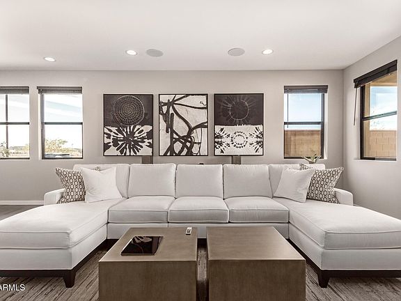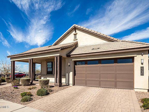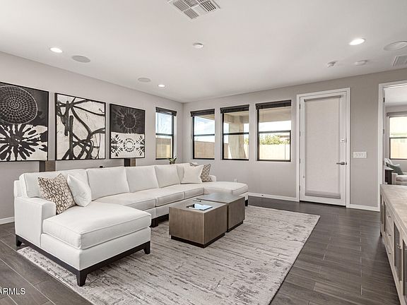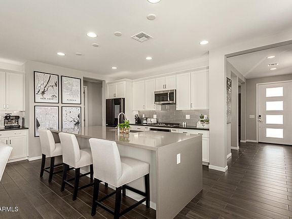 This beautiful 3 bed, 2.5 bath home sits on a premium corner lot in the highly sought after Eastmark community. With great curb appeal, it features a manicured landscape, two car garage, paver driveway, and a charming front porch. Inside, the open concept layout boasts wood look tile flooring, a neutral color palette, and a spacious great room. The chef inspired kitchen offers stainless steel appliances, subway tile backsplash, ample cabinetry, and a large center island. The primary bedroom includes a walk in closet and ensuite with dual sinks. A cozy den is ideal for a home office or reading nook. Enjoy a private backyard with a covered patio and access to Eastmark's community pool, parks, and walking trails.