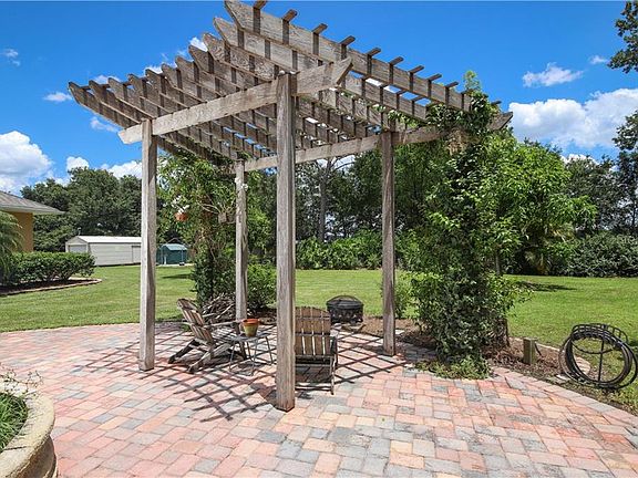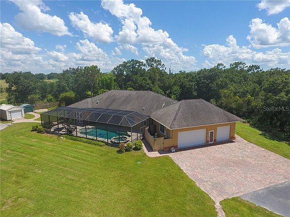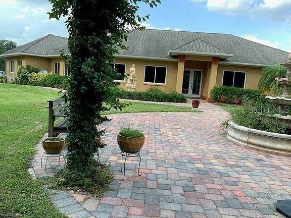 As you drive through the private electric gate, you will drive down this paved and tree lined entrance and notice the fine thought and detail given to this home. This beautiful 4 bedroom and 3 bath pool home is a Must See! Located in Magnolia Hill Subdivision on 5.8 acres. This lovely home is constructed of poly steel poured concrete that offers energy efficiency. The kitchen has beautiful granite counter tops and an island to enjoy family gatherings. This home has an open floor plan and high ceilings. There is an office off of the great room. This home has 2 sliders that open up to the salt pool area with an outdoor kitchen. Enjoy gatherings and entertaining in the outdoor kitchen that has a grill, ice maker and refrigerator. The salt water pool has a Jacuzzi spa and the pool decking is tile. The large pool area with lanai is caged. The Master Bedroom opens up to the pool area through the French doors. The Master bath has 2 walk in closets, dual sinks and Whirlpool tub with a separate shower. The 3 car garage has Epoxy flooring. There are pavers sidewalks around the home. Tropical trees and mature landscaping throughout the property. The lagoon with island and bridge has a separate well. There is an area under the shade trees would be a great area for relaxing or cooling off in the heat of the day. The court yard at the front of the home has pavers and a pergola that offer beauty and charm to this lovely property. In the middle of the property, there is a metal building with concrete floors that could be used for a detached garage or storage building. This home is private and cannot be seen from the road. There are 2 storage sheds also on this property. This home was built in 2007.