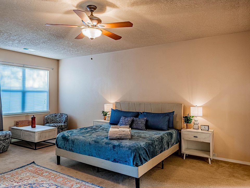 Check out this southwestern, two-story house with 4 bedrooms and 2.5 bathrooms! The master bedroom is on the first story with a king-sized bed and a private full-sized bathroom with an extra large closet! There are three bedrooms located on the second story! Two bedrooms have queen-sized beds, and the third has a bunk bed with two twin-sized mattresses! The three upstairs bedrooms do share a full-sized bathroom! This house includes a spacious living room with a big TV, a big kitchen with a lot of cabinet space, and a backyard with a patio! This house does have central refrigerated air, to keep you nice and cool in the Summer, and central heating for the winter months! We can only allow for month-long bookings at this property but your pets are more than welcome to join! We accept pets, please see additional house rules for our specific Pet Policies, including fees and deposits, as well as other pertinent information regarding your stay