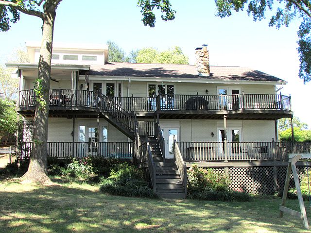 Waterfront property. Breathtaking views. Over 4100 sq ft (per appraisal). 5 BR, 3.5 BA open floor plan. Smooth high ceilings. Naildown hardwoods. Updated kitchen and master bath. Split bedrooms. Lg bonus overlooking lake. Includes dock and pontoon boat.