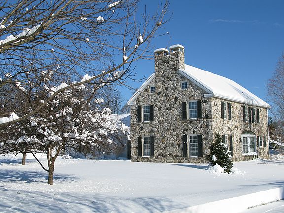 Classic colonial farmhouse design with real stone walls and fireplace, brick patio, specimen trees, beautiful architectural finishes throughout and all modern amenities, updated kitchen, new roof and windows.