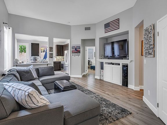 Welcome home to this meticulous 3 bedroom, 2 bath SINGLE story Erringer Meadows home which is rarely on the market! You'll fall in love as soon as you step inside this completely remodeled open and spacious floor plan. Features include beautiful laminate wood-like flooring in living area, kitchen and master bedroom; along with wide plank baseboards and custom paint. Secondary rooms have newer carpeting and new blinds. The immaculate living room boasts vaulted ceilings and custom built in entertainment center leading into the remodeled kitchen; including Samsung appliances and Quartz counter-tops. Step outside to a built in BBQ perfect for entertaining along with sun shades and string lights! Custom sod landscaping with added lights in front. All this on a wonderful cul-de-sac!