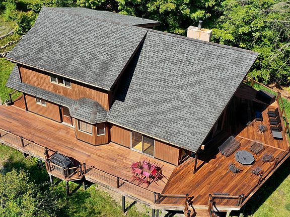 Private lakefront paradiseWrap-around ipe deckPropane forced hot airOpen-concept chaletHardwood and tile floorsSoaring vaulted ceilings