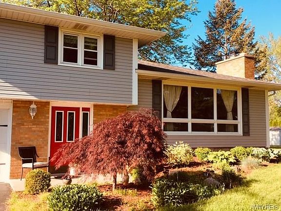 Relocating owner is going to miss this great back yard with covered concrete patio and mature pines. The home sits back from the road and has Views of the 10th fairway and creek of the Niagara Frontier Country Club. The inside is bright and airy with newer windows throughout. The living room has a wall of windows for viewing fox & deer on the land across the road, and a Brick WPFP that's adjacent to the formal dining room. The eat in kitchen has some newer stainless appliances plus a counter top stove. Step down a few steps to the family room and half bath. Newer sliding doors bring you out to the back patio. The basement also has access to the yard via a walk out and bulkhead doors- GREAT for storing those outdoor items! The home is easily reached via the Niagara Scenic Parkway North