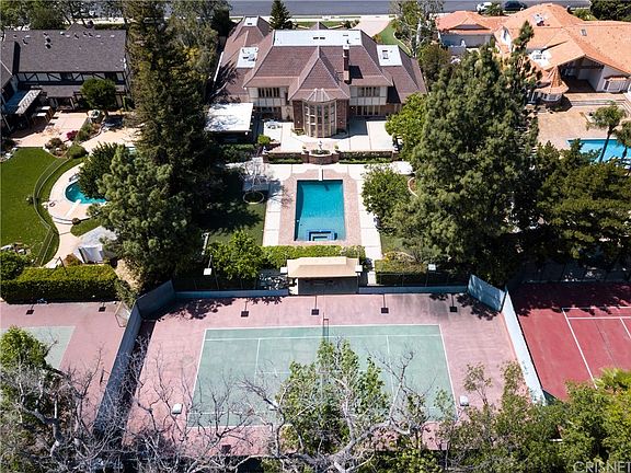 Stately. Impressive. Quality. Custom designed by "Architect to the stars" Harold W. Levitt, AIA, with interiors by Beverly Hills designer Thomas Buckley. Over 36,000 sq.ft. of country club style grounds include a tennis court with pavilion, pool & spa, putting green, swing cage and trampoline. The dual, sweeping staircase welcomes your guests to the beauty beyond. Both the entry and living room share 2-story high ceilings with statley windows framing the grounds beyond. Details include an Italian marble fireplace, custom designed carpet and grand entertainment center. Off the entry is a formal dining room and an exquisite library crafted with walnut bookcases and ceiling medallion accented with hand painted gold designs and french doors to the patio. The ground floor Master Retreat features a large bedroom with coved ceilings, french doors to the patio, an exercise room with sauna and a master bath with dual walk-in closets, custom painted sinks and a deep, jetted tub. The kitchen was designed with entertaining in mind with top of the line appliances and ample storage for silver and serving pieces. Also featured is a large eat-in dining area, dumbwaiter, and easy access to the basement for more storage or a future wine cellar. Completing the ground floor is a maid's quarter with ensuite, laundry room, and workshop. The 2nd floor has a balcony connecting 2 bedroom wings. Each wing has 2 bedrooms with Jack & Jill bath rooms, ample closets and leaded glass windows.