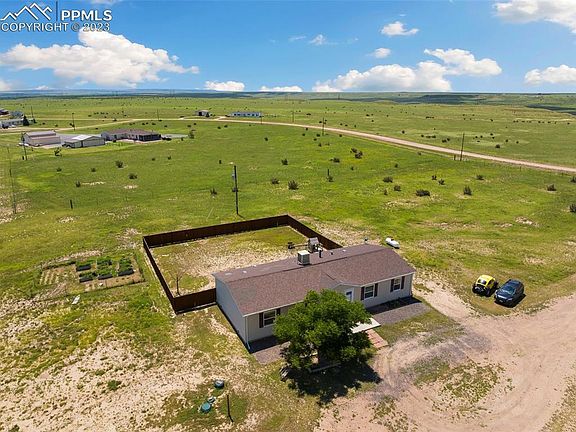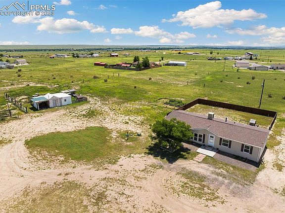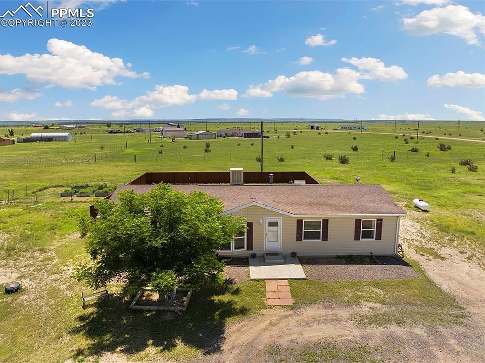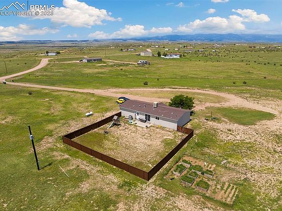 Quiet & secluded home on over nine spacious acres, complete with shop, storage shed and animal pens! Enter through the front door to an open floor plan featuring laminate flooring throughout and an abundance of natural light! There are all stainless steel appliances in the kitchen, cabinets & open shelving and a walk-in pantry. Pull up a chair and enjoy the kitchen peninsula. The separate dining space is centered in front of the sliding glass door that overlooks the fenced backyard. The large primary bedroom is private on it's own side of the home and hosts a walk-in closet and a private five-piece bathroom suite. There are three additional rooms and a full guest bathroom down the hall on the opposite side of the home. Let your creative side take action with wide open acreage to do as you please with beautiful views of the front range!