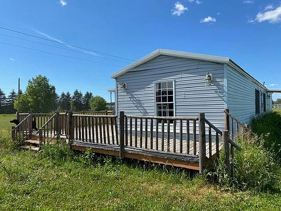 2 possible 3 bedroom mobile home with 2 baths. There is a large deck overlooking 5 acres. Also included is a 24 x 24 garage and 30 x 40 garage (partially finished that was used to grow marijuana) with a 10 x 16 lean to.