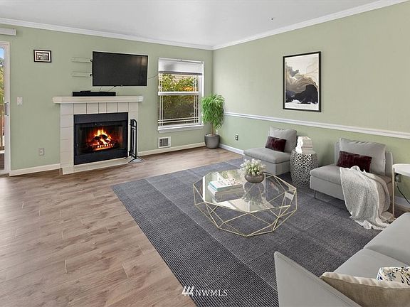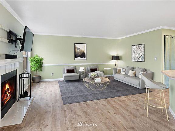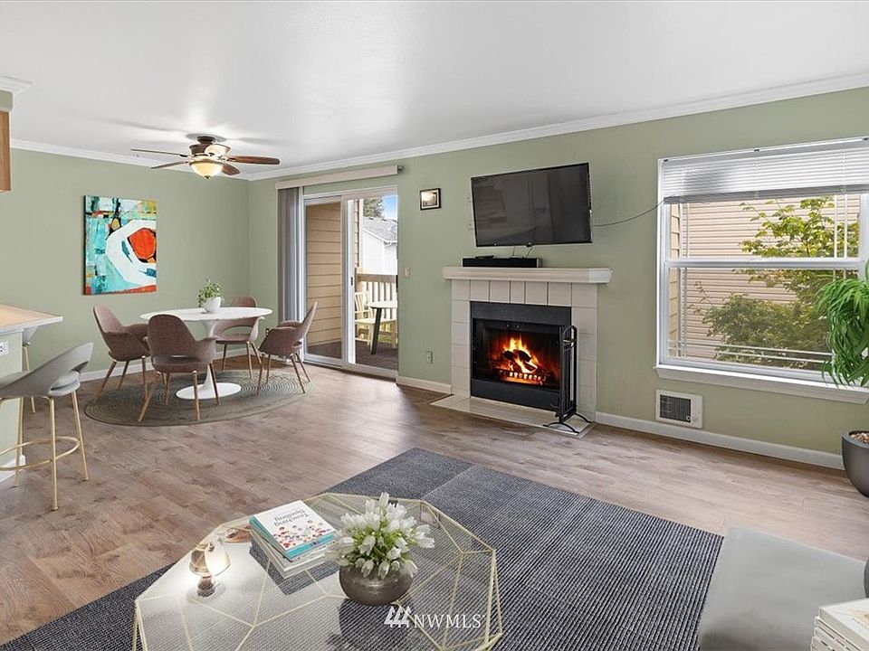 Lovely 1 Bedroom 1 Bathroom Condo with Garage features inviting kitchen with white appliances, tiled counters, breakfast bar & is open to dining space with slider door to rear deck area with storage closet! Adjoining spacious family room with cozy wood burning fireplace. Restful master bedroom + updated full bath! Brand new flooring throughout and newly installed hot water tank. This lovely condo features a 1 car garage for all your storage needs + 1 assigned uncovered parking space & ample visitor parking. Low HOA ($234) covers water/sewer/garbage and exterior has recently been painted. Pet friendly HOA! Just minutes to Paine Field Airport, Boeing, dog parks, all major routes & more. Home is truly move in ready!