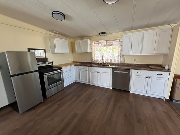 Country living close to town. This 3 bedroom, 2 bath home has been updated with new interior/exterior paint, roof, tie-downs, flooring, kitchen appliances, bathroom vanities, new shower and toilet in primary bathroom and new plumbing under the home. Enjoy the covered deck while looking at the views of the mountains. The property is fenced with a detached 2 car garage with a workshop area and lean to area for lawn equipment or wood storage, a storage shed, and covered pens for 4H animals.