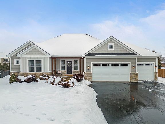 This impeccable luxury ranch home boasts a spacious open floor plan with a grand foyer, open staircase, and modern lighting. With 4 bedrooms, 3.5 bathrooms, and a 3-car garage, it offers a vaulted living and dining room with a stone-accented fireplace. The chef's kitchen features tiered cabinetry, a center island, and modern black stainless steel appliances. Guest bedrooms 2 & 3 have detailed wall accents and share a convenient Jack and Jill bathroom. The master suite includes a walk-in closet and spa-like bathroom. The first-floor laundry room is equipped with custom lockers/shelving to keep things organized. Additionally, enjoy a finished look-out basement with a 4th bedroom, full bath, office, dry bar, playroom, and custom-built cabinets, complemented by beamed ceilings and Shiplap wall detail. Other luxurious details throughout the home feature bamboo hardwood floors, custom tile, quartz & granite counters, custom tile work and upgraded lighting. The garage is a DIY haven with Gladiator Gear Walling. A smart home with Nest features, water softener, and reverse osmosis system. The fenced backyard is professionally landscaped, with deck, patio and play-set overlooking a spacious yard in a prime Sycamore location near parks, ponds, schools, and more. Seller is IL Licensed Broker and prefers beginning of May close date.
