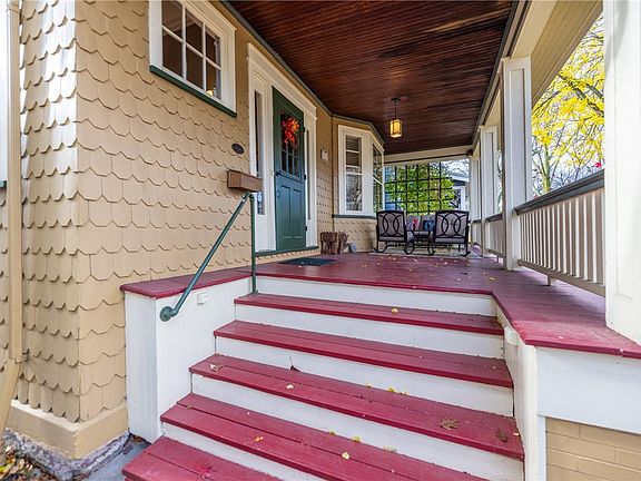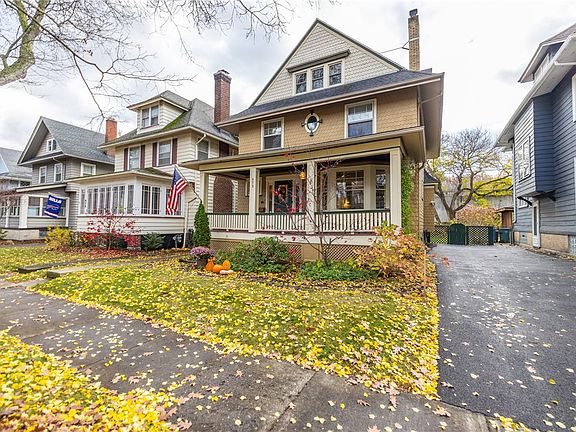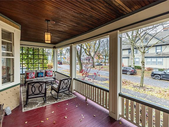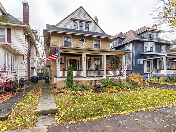 Welcome to the Park Avenue area! Experience city living at its finest in this charming 1915 home, updated for modern comfort while preserving its historic charm. The scalloped cedar siding exudes warmth and timeless appeal, complemented by a welcoming, covered front porch. This home offers a renovated kitchen with granite countertops, stylish backsplash, updated cabinets, breakfast bar, and a pantry with sliders. Appliances are included. Newer first floor powder room, a renovated full bathroom on the second floor, and a full bathroom on the third floor. Gather around the gas fireplace in the family room and enjoy the bay window filled with natural light. There is character throughout, showcasing its original glass doorknobs, stunning hardwood floors, coffered ceilings in the dining room, leaded glass windows, and a cozy bistro room with newer windows, cabinetry and shelves. Enjoy the sunlit space in the four-season rear conservatory/sunroom, overlooking the private backyard, with perennial gardens, flowering shrubs, and a storage shed. In the basement, you will find a newer water heater, A/C, furnace and plumbing. The basement features glass block windows with vents, washer and dryer, plus storage space. There is bonus storage space in the finished, insulated attic with a bedroom and full bath with the original clawfoot tub, plus an unfinished room that has great potential. The driveway has been newly paved. The home sits in a prime location with nearby restaurants, the Eastman Museum, and Wegmans are within walking distance. Don’t miss this rare opportunity to own a beautifully updated piece of history in the heart of Park Avenue. Delayed negotiations are due on Tuesday, December 10th at 1:00 p.m. Private showings only.