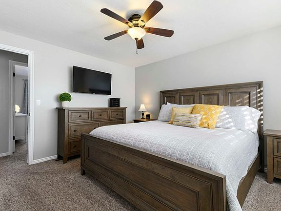 Four bedroom two bathroom home located in desirable Layton neighborhood. Recent upgrades include a craftsman style front door, new carpet throughout, new laminate kitchen flooring, back sliding door with built-in blinds, gas fireplace with smart features, and recently replaced HVAC system & water heater. The laundry room is plumbed for a third bathroom. Spacious yard with mature trees, peach tree, raised garden beds, and brand new Lifetime swing set. Fiber internet available through Utopia!
