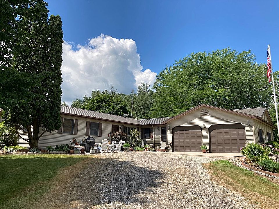 Beautiful, well maintained, updated ranch on 5.62 acres with several outdoor gathering spaces. Private yard with pond and mature trees. This is an outdoor lover’s dream. This 4 bedroom, 3 bath home has an open floor plan with a wood burning fireplace. Kitchen, laundry, and baths have been recently remodeled/upgraded along with fresh interior paint throughout majority of the home in 2020. Loads of storage, closets, and cabinets. Steel roof installed in 2013 (50 year warranty), AC installed in 2016, new dishwasher 2018, new hot water heater 2019, water softener (owned), stainless steel appliances, Ring doorbells, and more. Large attached garage has additional storage, attic, a work bench along with plenty of room for two large vehicles. A 30 x 40 pole barn is located on the property. This home is a must see!