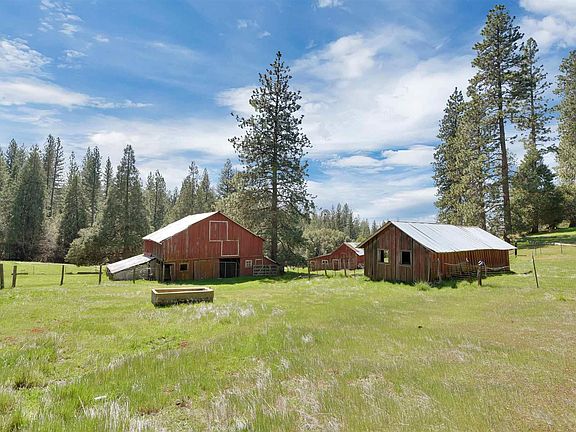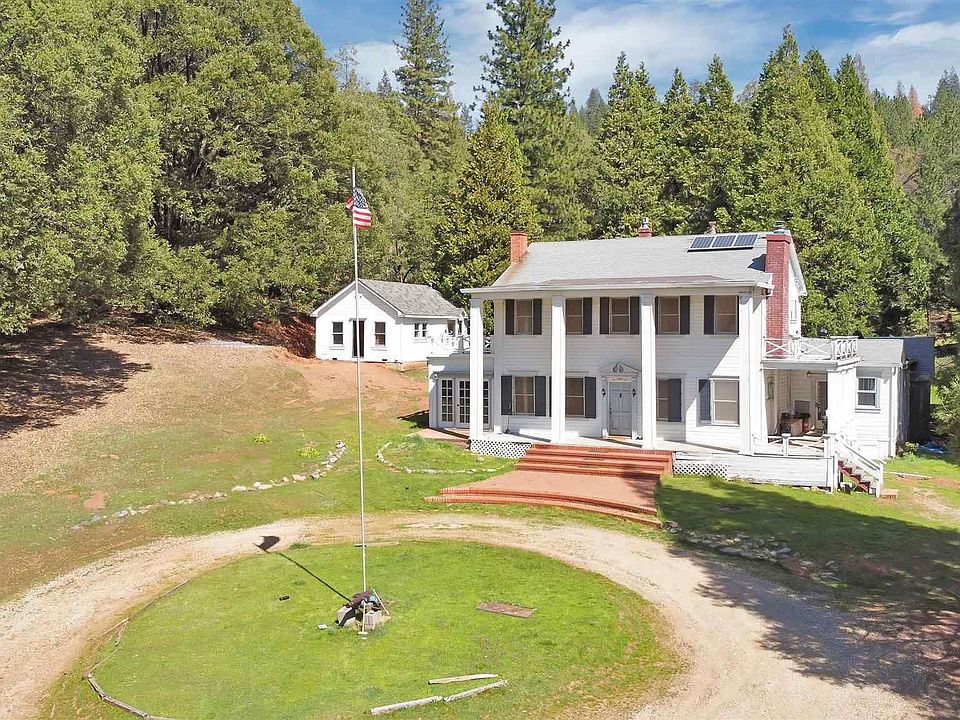Adventure awaits you at Edens Gate. This is one of the most unique properties you will come to find in the Motherlode. Enjoy your own personal Yellowstone lifestyle with over 130 acres of some of the most beautiful land to be found in Gold Country. Bring your horses and explore the miles of trails, bike up to your own reservoir, explore the surrounding woods and bring plenty of friends and family to your own personal retreat and compound. This rustic retreat still boasts some of the most modern amenities: solar panels and Elon Musk's Starlink high speed wifi, as well as a solar automatic entry gate. At the core of this property is a unique, historical, and grand two story colonial home with traditional columns, beautiful pediment accents over doors and windows, 3 fireplaces rich with molding details, interior and exterior French doors, a