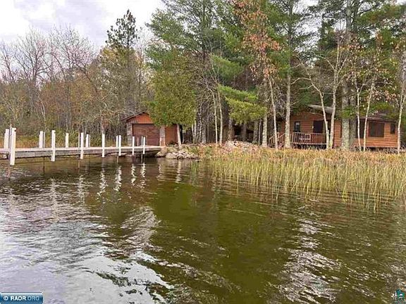 Escape to your own seasonal paradise in this cozy 2 Bedroom cedar-sided cabin, nestled on a serene point on the water's edge. With an impressive 375 feet of private lakeshore, 2+ acres adjacent to state and federal land, and a level lot, this property offers ample space for outdoor activities and potential future development. Majestic pines grace the landscape, providing natural beauty, privacy, and that unmistakable Northwoods ambiance. Just minutes away from Timbuktu Marina, making boating and fishing adventures a breeze. and convenient access to supplies and services. Comfortable cabin with open design, wood burning stove, cedar T&G paneling, spare room perfect for a future bathroom, boathouse (12X24), and two sheds. Experience breathtaking sunsets off your dock, creating picture-perfect moments right at your doorstep.