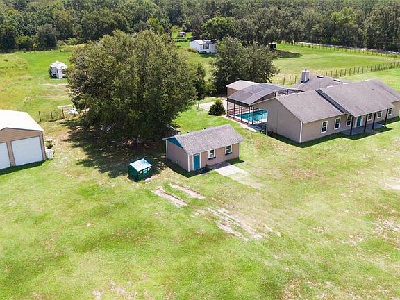 One or more photo(s) has been virtually staged. USDA Eligible! Welcome to your forever retreat—where serenity meets possibility. Set on 5 high-and-dry, fully fenced acres with no HOA, this custom-built 4-bedroom, 2-bathroom pool home with a den/office combines peace, privacy, and modern upgrades, while also featuring a beautifully renovated 1-bedroom, 1-bathroom accessory dwelling unit (ADU)—ideal for multigenerational living, a home office, guest accommodations, or income potential. Inside the 2,540 sq ft main home, soaring ceilings and abundant natural light highlight the fresh neutral paint and new laminate flooring, creating a warm and inviting atmosphere. The spacious family room centers around a cozy wood-burning fireplace, while the chef’s kitchen impresses with custom wood cabinetry, quartz countertops, a gas range, a walk-in pantry, and new GE appliances. A split-bedroom layout ensures privacy, with the owner’s suite offering French doors to the lanai, a walk-in closet, and a spa-inspired ensuite featuring a soaking tub, tiled walk-in shower, and stone-topped vanity. Secondary bedrooms are generously sized with high ceilings and ample storage. Step outside to a private Florida oasis with a screened, covered lanai and a sparkling pool, resurfaced in 2020, perfect for relaxing or entertaining. The renovated ADU includes an efficiency kitchen, full-size refrigerator, and bathroom, providing exceptional versatility. For the car enthusiast or hobbyist, the property boasts a massive 30x36 four-car detached garage/workshop with roll-up doors, plus an additional two-car garage and dedicated RV hookup. Animal lovers will appreciate the 5-stall goat barn, horse-friendly zoning, and fully fenced layout with three gated entrances. Peacefully located on a quiet private road with minimal neighbors, yet only minutes to Hwy 27, Hwy 33, Publix (6 mi), Clermont (9 mi), Orlando (32 mi), and Tampa (72 mi), this one-of-a-kind property isn’t just a home—it’s a lifestyle.