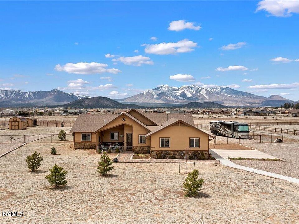 The single level Slayton ranch home has a split floor plan and spectacular views of the San Francisco peaks. Exterior has RV parking with hook ups, two horse stalls with a tack room and access to water, and a storage shed with electricity for all your outdoor toys. The interior has a great room concept with wood floors, vaulted ceilings, and a fireplace. Kitchen has stainless steel appliances, breakfast bar, granite countertops, gas cooktop and convection microwave. Home has recently been updated. Proximity to trails for riding. This mint condition home won't last long!