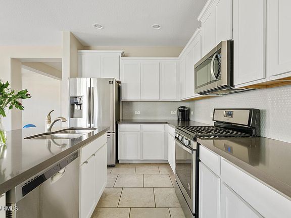 Charming home available in the highly sought after Cadence at Gateway community. This upgraded 4 bed 2.5 bath + den home has a great floor plan; ideal for both living and entertaining with a split floor plan and open concept living space with a covered patio off the dining area. The kitchen features stainless steel appliances, tiled backsplash, quartz countertops, and space for guests to sit at the island. The spacious great room easily fits a large sectional, a separate dining area, and it opens up to a covered patio. The backyard includes a covered patio, pavers, jacuzzi hook up, and easy maintenance turf. The adjacent flex room makes a fantastic office space, exercise space, or extra living room. Beautiful tile flooring throughout with carpeted bedrooms. The Large primary bedroom, in the back of the house, has enough space to fit a king sized bed, two nightstands, a dresser, and more. The primary bathroom features double vanities, tiled walk in shower, and a spacious walk-in closet. The second and third bedrooms, at the front of the home, all easily fit queen beds.