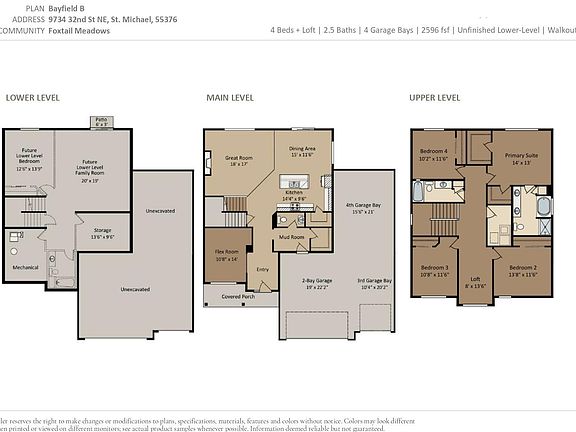 Highlights include a Spacious 4 BAY GARAGE (1010 sq.ft.) located on a Corner Walkout Homesite! Front elevation features a Concrete Front Porch & Stone Accents. The Bayfield floor plan offers a modern styled thoughtfully crafted open-concept design. Main level boasts a Great Room with Fireplace, Flex Room, Decorative Stair Rails, Expansive Kitchen with walk-in pantry & spacious center island, Mudroom, Half Bath, and 9' Ceilings. Upper Level features 4 Bedrooms, 2 Bathrooms, Versatile Loft, & Laundry Room. Primary Suite offers Two Walk-In Closets & Private Deluxe Bath including Soaking Tub, Separate Shower with Tile Surround, Double Sink Vanity, and Linen Closet. Spacious Walkout Lower Level ready for future finish including future family room, 5th bedroom, 4th bathroom, & flex/storage room. Rendering & may not depict actual plan, materials, & finishes may vary. All measurements are approximate.