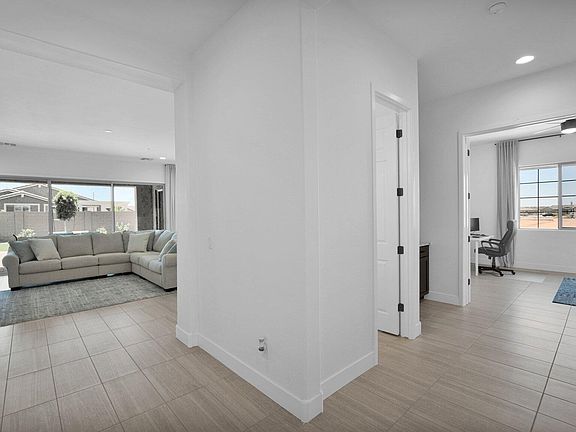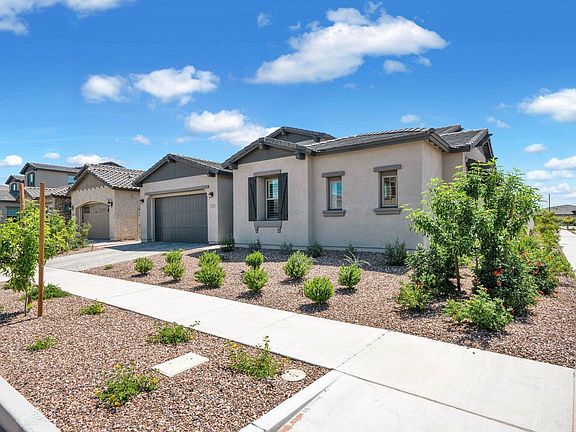 Move right in to this highly upgraded home in the award winning Eastmark community! This functional floorplan features 4 beds + den, 3.5 baths, and an open concept greatroom. Over $140K in upgrades, including 12x24 tile throughout the whole home, wide baseboards, 10ft. ceilings, and upgraded fans and lighting. The chefs kitchen is an absolute dream, offering cabinets that extend to the ceiling, granite counters, herringbone pattern backsplash, stainless gas appliances, corner pantry, and a huge kitchen island that is perfect for entertaining! The luxurious owner's suite is located at the back of the home and includes a bay window extension, ensuite bathroom with double sinks, walk-in tiled shower, and huge closet. Step outside through the sliding wall of glass where you'll find a beautiful landscaped backyard complete with a covered patio, extended pavers, artificial turf, and low maintenance yet stylish landscaping. Sitting on a large corner lot and surrounded by all single level homes helps to ensure added privacy to enjoy your new backyard. Eastmark is the #1 Master Planned Community in all of Arizona with an abundance of amenities, dozens of parks, and tons of fun events. If you are looking for a true turn-key home, this beauty can be sold FULLY FURNISHED! A true must-see home in a wonderful community that is waiting for you!