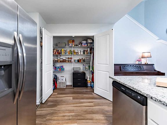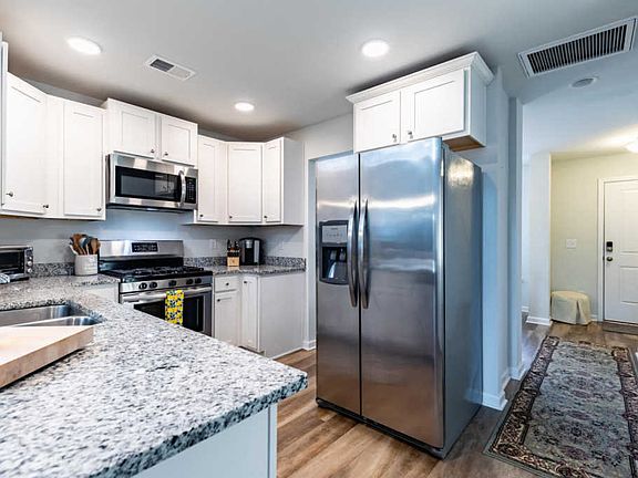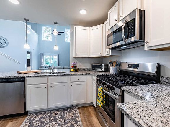 STUNNING 3 bedroom, 2.5 bath end-unit townhome with all the upgrades & resort-like amenities! This 1 year old townhome still looks brand new & boasts luxury vinyl hardwood floors throughout the foyer, half bath, dining, kitchen & living room, beautiful white kitchen with stunning granite counters, a gas range, stainless steel appliances, pendent lighting above the bar and so much more! The impressive 20' ceilings in the living room allow a ton of natural light & you'll feel massive privacy with a wooded area right behind the home. The first floor master boasts a beautiful bathroom complete with a huge shower, double vanities and an enviable walk-in closet. Upstairs has 2 BR's, a full bath, huge loft & office nook. Resort like amenities include pool, pickle ball, fire pit & playground.