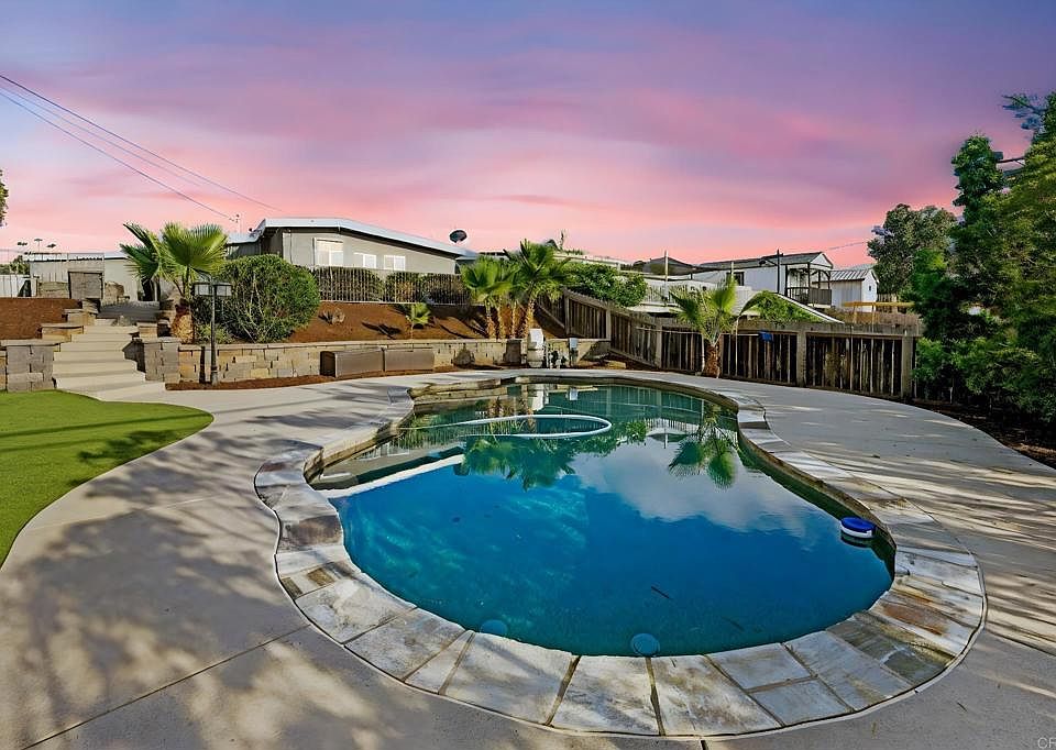 Perfect sunset views await you in this 4-bedroom + utility room and 2-bathroom home complete with a pool and spa – ideal for a growing family! As you go inside, you’re greeted by a newer kitchen with barstool seating that connects to the living room, where vaulted ceilings and a cozy fireplace create a warm and inviting atmosphere. Just off the kitchen, you’ll find the primary bedroom featuring vaulted and beamed ceilings, plus direct access to the backyard – perfect for relaxing evenings or early morning coffee outdoors. Down the hall are three additional bedrooms, each with ceiling fans, and two full bathrooms. The versatile utility room that can serve as a home office, 5th bedroom, or playroom, along with a separate laundry room are perfect for added space and convenience. Outside awaits your private backyard oasis – an entertainer’s dream! Fire up the grill for summer BBQs, unwind in the spa, or take a refreshing dip in the pool while soaking in breathtaking sunset views. The backyard is complete with turf for low-maintenance living and pool solar to help keep the water warm. Additional features include a water softener system, ductless A/C units for comfort, and a fenced-in front yard for extra privacy. With quick freeway access, you’re just a short drive to Downtown San Diego, beaches, shopping, dining, and all the attractions this city has to offer. Don’t miss your chance to call this beautiful home yours – it’s California living at its finest!