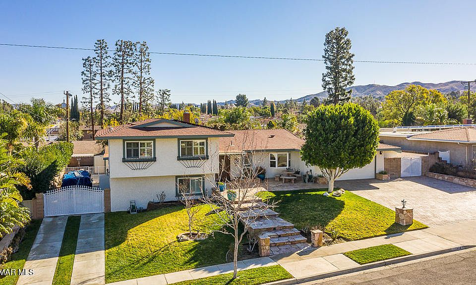 Simi Valley Turnkey Family Pool Home. Walk through the Double door entry to an open living room with gas/wood fireplace. Custom kitchen cabinets, granite counter tops and stainless steel appliances. Crown molding in entryway, living room, master bedroom and master bath. Custom shutters in family room, bedrooms and bathrooms. 3 bedrooms upstairs and 1 bedroom and bathroom downstairs with large family room and its own entry. Perfect for Mother n Law Suite. Custom Sliding Glass doors in living room and family room. Remodeled bathrooms. New carpet, closet organizers in bedrooms. Multi Chandelier lighting. Bay window in kitchen and master bedroom. The Backyard Features- Covered patio outdoor remote fan, Pebbletec pool with lounge area, above ground Spa with multi jet Jacuzzi, Outdoor BBQ island with side burner and fireplace. Northside of property is a drive up driveway for the RV with waste disposal (clean out) 30/50 amp plug in for RV. Along side is a hot/cold pet bath station. Outdoor Multi-zone Air Conditioner system, 220 Electrical Panel. Separate Storage room with electrical. Walk-in Work shop include cabinets, desk and workstation. Bulit-in cabinets in Garage. Driveway has been extended with pavers. Flagstone walkways. Solar panels. Must see