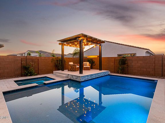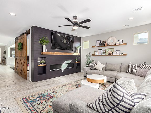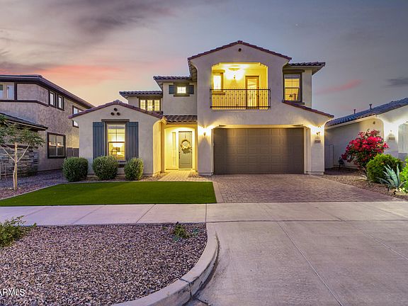 WELCOME TO YOUR HUMBLE ABODE! This jaw dropping, move-in ready 4 bedroom home is nestled in the highly sought-after Eastmark community. The beautiful paved driveway, artificial turf, balcony, blue exterior shutters and front door enhances this home's charming curb appeal. Walking into the home you will be greeted 3465 sqft of impressive living space. Throughout you will notice neutral paint, highly desirable wood-look tile flooring, custom farmhouse barn doors, and soaring ceilings. The gourmet kitchen boasts white quartz countertops that perfectly accompany the two-tone cabinets which produce ample storage space, soft close drawers, upgraded black hardware, hexagon tile backsplash that extends all the way to the ceiling, modern pendants lights, a gas stove top with ..CLICK MORE... pots & pans drawers, a custom built-in pantry, farmhouse sink and luxurious slate appliances. The kitchen overlooks the dining space that encompasses the extended cabinetry from the kitchen and a gorgeous view in the beautifully designed backyard. The gas fireplace surrounded by the shiplap wall offers a quaint and cozy atmosphere in the living space. One of the best aspects of this home is the outstanding master suite, the room has direct access to the balcony overlooking the front yard, a massive shower with a rainfall shower head, custom tile from floor to ceiling, quartz countertops, and dual walk-in closets. Now let's talk about this backyard; the covered patio offers a breathtaking view of the artificial turf, fenced off heated pool that has an ideal sized baja step with a luxurious spa and a pergola which offers additional shade over the pool area. It's the perfect area for entertaining guests. Just like a world class resort this community offers a luxurious community pool, splash pads, numerous parks spread throughout, the Steadfast farm, the Handlebar Diner, and its very own state-of-the-art clubhouse "The Mark". The Mark hosts events throughout the year and a wide variety of family friendly games to play. If this home checks off