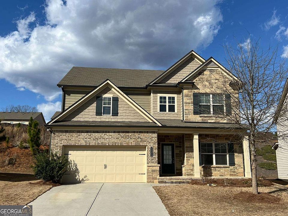 Stunning 2017-built home boasting immaculate stone front and hardwood floors throughout the main level. Features include a spacious living room, formal dining room, and open-concept kitchen overlooking the family room. All 4 bedrooms and laundry are conveniently situated upstairs. The master suite features dual closets and a lavish bathroom with tile flooring and an expansive walk-in shower. Additional bedrooms share a hallway bathroom. Custom patio with fireplace for entertaining. All-electric utilities, convenient location near restaurants, and easy access to I-85 just 3 miles away. Great neighborhood setting! Move-in Ready!