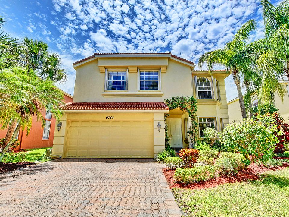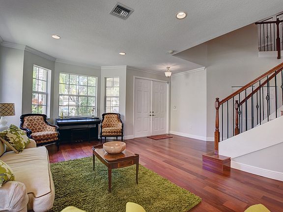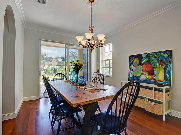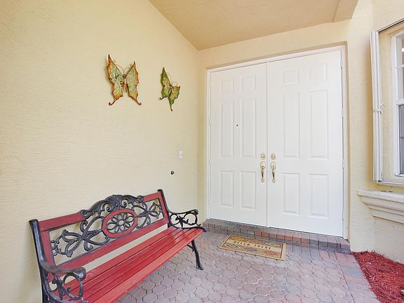 The double doors of the covered entryway open to a large living room with a bay window and a spiral staircase. The floors on both levels are wood. The kitchen has lots of counter space and a breakfast bar all in granite with a full granite backsplash; stainless steel appliances and walk-in pantry. The dining room leads out to an alcove in the patio area which has a remote controlled hurricane screen for pest-free & private alfresco dining. The large paved patio overlooks the landscaped, fenced yard with fruit trees. The master bedroom has 2 walk-in closets, and a bathroom with separate shower, tub and private toilet. The home has accordion shutters and is located in amenity-rich Olympia with 240 acres of lakes & preserve, active clubhouse with gym, tennis, basketball, pickleball, resort-