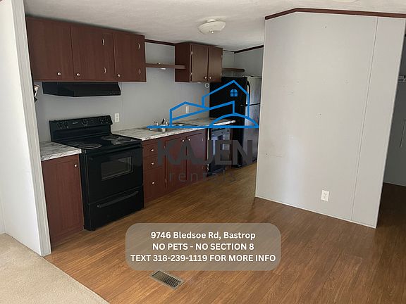 -No Section 8 -No Pets -No rent to own -No smoking inside -Rent is $800.00 -Deposit is $800.00 -Income will be verified on each tenant. -Central Heat and AC. -Located at 9746 Bledsoe Rd Bastrop, LA -Stove, Refrigerator, Dishwasher Included. -3 bedroom 2 bath mobile home. -You pay utilities (electric, water, trash, lawn care) -$50 background and eviction check per adult.