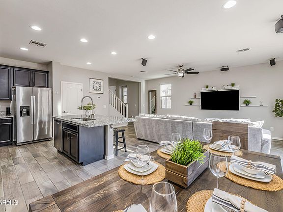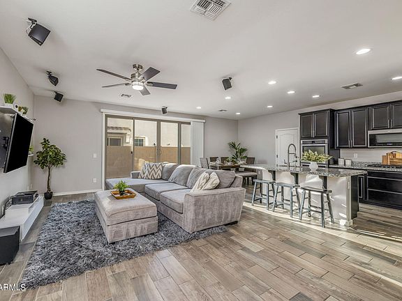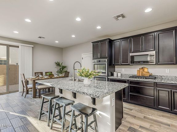 The home is nicely upgraded with beautiful granite counters, a double oven, gas drop-in cooktop, a large walk-in pantry, and ample storage space. The wood-look tile is stunning! Additional features include a tankless water heater, 3 zone AC system, and surround sound hookup! Eastmark is consistently ranked as the #1 master planned community in Arizona. Parks, activities (disc golf, fishing, baseball, volleyball, you name it, we have it) new schools and businesses popping up (seemingly) daily! MORE- The new route 24 highway makes commuting even easier. Come see why everyone is talking about this wonderful community!