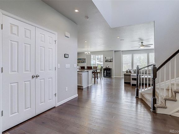 Exceptional nearly new home with the designer décor & colors buyers seek! Step inside and be amazed: 5" hardwood plank flooring throughout the main level, great room concept is all the rage with built-in surround sound & cozy gas fireplace. Spiral staircase is sure to impress. Just beyond the entry way is a JAW DROPPING designer gourmet kitchen with massive island, yards of granite, endless storage in artistically staggered cabinets, gas range, 2 ovens and convection microwave. Enjoy the breakfast bar, eating space, pocket office with additional storage that leads to a large pantry that all will envy! Step out to the fenced, over-sized stamped concrete patio, gazebo & garden boxes. Bring on the backyard entertainment!! Upstairs find the loft, secondary bedrooms with walk in closets, private full bathrooms and the Master retreat with spacious 5 pc. Bath w/soak tub & giant walk in closet! Full unfinished basement with upgraded 9 ft ceiling, 3 car garage, main floor study, upper laundry, storage galore, location +, minutes to N. Cherry Creek, DIA, Downtown, parks, trails, shopping, golf, dining and entertainment!