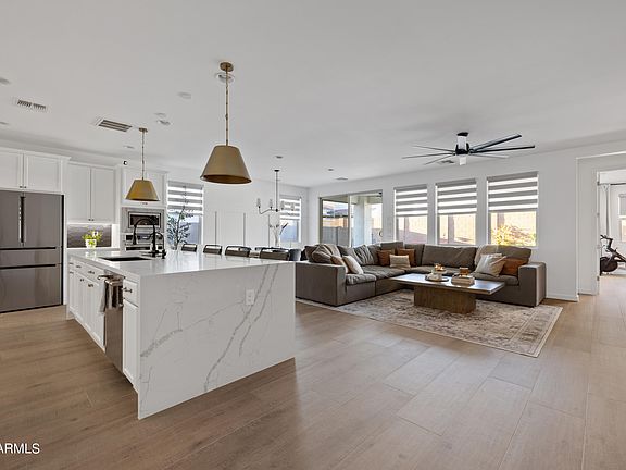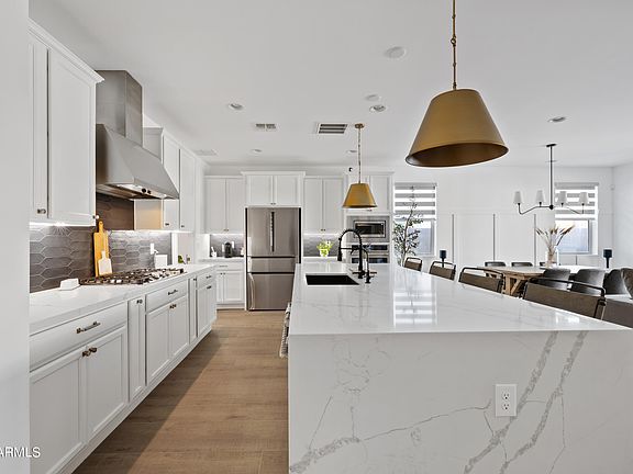 A meticulously maintained home in the highly desirable neighborhood, Eastmark! This single story features an open concept floor plan, 4 bedrooms and 3 bathrooms. The kitchen is gorgeous with quartz counter tops, 5 burner gas cooktop, built in SMART oven & microwave, white— soft-close cabinets, black— anthracite scratch resistant sink, pull out drawers, a spice rack & a baking sheet pullout. It also showcases an oversized island, beautiful tiled backsplash, and a large walk-in pantry. All bedrooms are perfectly sized! Custom batten walls throughout the hallways and dining room. And there's plenty of space for guests — featuring a front bedroom with an ensuite. Brand new flooring throughout! The living room has a custom Roman Clay 60 in. fireplace with a wooden mantle, perfect to get cozied up by after you take a shower in the oversized, custom tiled shower in the primary bathroom. The backyard offers a beautifully designed landscaping and a private salt water pool. These owners didn't spare on a single detail of this home! The backyard features: a mister system (much needed in the Arizona heat), and a Pool Scout Camera to monitor anything in the pool that shouldn't be with an app. Christmas lights will be easy to install this year because this home already has discreet permanent lights year round. Plus, your new home has leased solar panels making your SRP bill around $90 a month even in the middle of summer! This SMART home will be appreciated by any tech-y: CAT 6 internet throughout, Eero system throughout the house. Eastmark is the #1 Master Planned Community in all of Arizona with all of its amenities, hundreds of parks, and events. Come see what all the hype is about!
