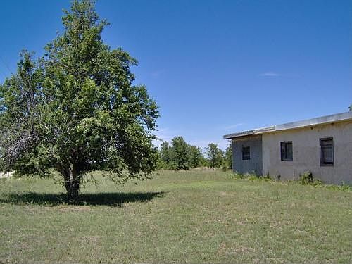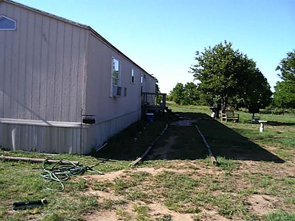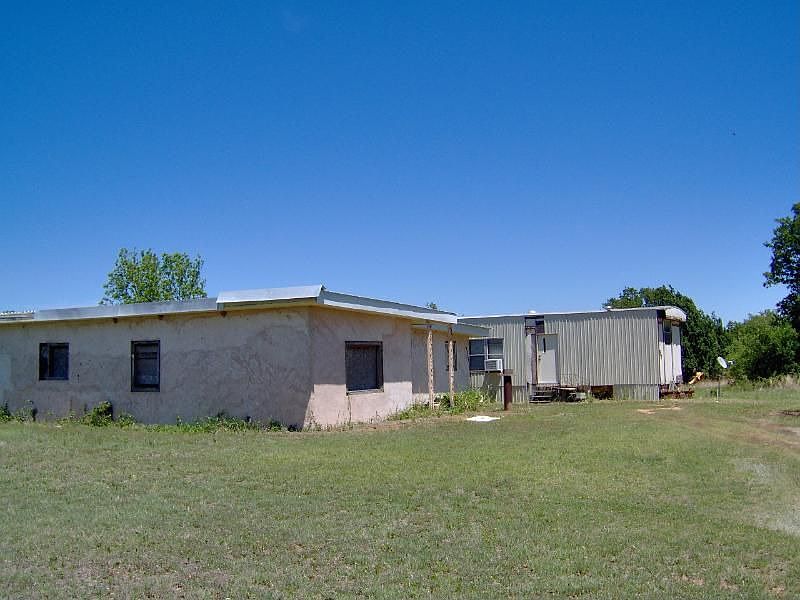 This property has ten acres of nice oak trees and some mesquites. There is a large amount of brush, with large oak trees around the single wide 4 bedroom home. There is also an incomplete 2000+ - building with slab floor, needs finishing on the inside.Rural water, electric, and is boardered on 2 sides by county roads, a great place to build while you live in the mobile home.