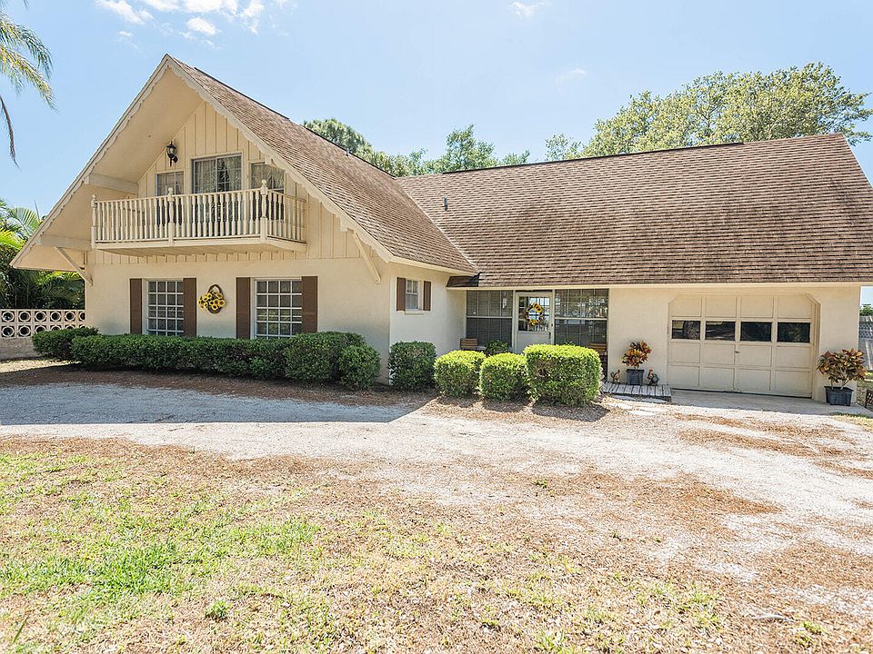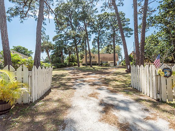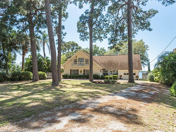 Tucked along the Indian River Lagoon's edge, this fixer-upper promises awe-inspiring views of its tranquil waters and breathtaking sunsets. Despite its weathered exterior, the potential is boundless. The interior exudes a warm timeless charm that has the potential to become a cherished haven, blending vintage allure with picturesque riverfront living. This two story home features 2320 SQFT of living space, five bedrooms, three bathrooms and a one car garage with a front and rear entrance. The exterior is accented with board and batten finishes on the second story and decorative shutters. This adorable northern style home sits on 0.34 acres with aged pine trees and lush landscaping. As you step inside the enclosed breezeway, you're immediately drawn to the relaxing view of the river. The interior of the home boasts an open floor plan with wood burning fireplace, eat in kitchen, and a family room with double sliding glass doors featuring panoramic views of the Indian River.