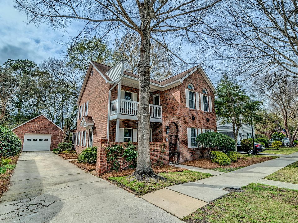 On a tree-lined street in one of Mount Pleasant's most established and sought after neighborhoods, this Old Charleston style home exudes a timeless design with its rare all brick exterior and courtyard style entrance. The open and unique floor plan offers two master suites, one on the main level and a master retreat on the second level boasting two closets. Adjacent to the second floor master is the third bedroom loft which is currently utilized as a den and library with home office. The second floor balcony is located just off of this area. A privacy wall can easily be added to this bedroom space. The workable and updated kitchen offers plenty of cabinetry, two pantries, tiled backsplash and tile floors. A convenient side door entrance from the driveway makes unloading groceries a breeze. Perfect for entertaining, the large and open great room features soaring vaulted ceiling, lots of windows to allow an abundance of natural light, including stunning custom stained glass Palladian style windows and a gas fireplace with beautiful mantle. Outdoor living space is plentiful. In addition to the front porches, a screened-in porch of impressive proportions wraps around the rear of the home and looks onto the large and natural backyard which is dotted with Palmettos and shade trees. A customized, detached, one and a half car garage offers not only ample storage space but a separate studio/workshop with electrical in place. Located in one of Mount Pleasant's most desired golf course communities, Snee Farm is in the heart of Mount Pleasant and offers membership opportunities to Snee Farm Country Club. Snee Farm is just minutes to the beaches, I-526 and all of the world class shopping and dining in historic downtown Charleston.