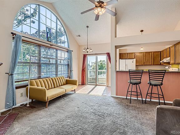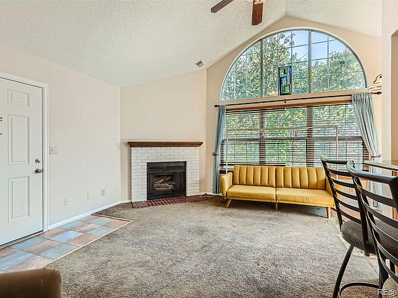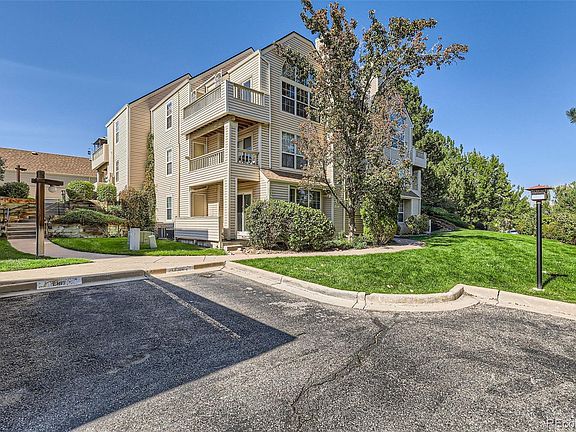 Generous price improvement! Come see this this charming top floor end unit condo that combines the living, dining, and kitchen areas together. Vaulted ceilings, a fireplace & lots of natural lighting make this area cozy as well as welcoming for entertaining. The kitchen has ample cabinetry & boasts heated tile flooring as well as updated countertops. Enjoy your breakfast while sitting at the breakfast bar or while seated in the dining area overlooking the balcony with lovely views, updated sliding door, composite & additional storage. Both bedrooms offer ample space, and one features a walk-in closet. The connecting bathroom (has been updated) design provides convenience and functionality and is accessible from both bedrooms and the hallway. Primary bedroom has newer flooring. Condo comes with a detached assigned garage and a reserved parking spot. Community pool, playground &park. HOA includes community pool, water and sewer, trash removal, snow removal, and grounds maintenance. East access to public transportation, lots of shops, and eateries. Easy access to 6th Ave and Hwy 285 for access to downtown, DTC, Blackhawk or Central City for work.