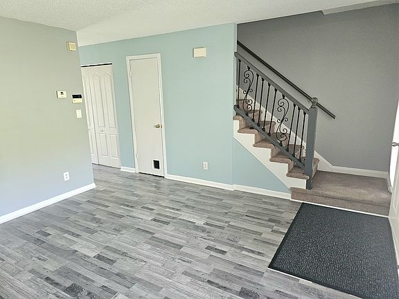 You'll love this chic 2 bedroom, 1.5 bath stylishly appointed home! Updated faux wood LVP flooring spans the main level, complemented by elegant lighting fixtures throughout that add a modern touch. The kitchen boasts a breakfast bar, tile backsplash, and sleek Corian countertops. The upstairs living area has a full bath featuring tiled floors, tile backsplash, a marble vanity and modern nickel-plated plumbing fixtures. The exterior consists of a spacious and relaxing covered porch to enjoy outdoor comfort, as well as an exterior utility closet in the rear for extra storage. Community pool for enjoyment of all the lucky residents of this beautiful community.