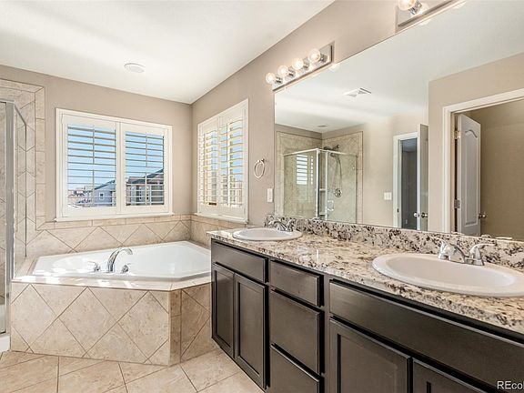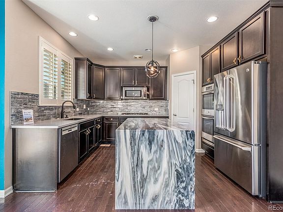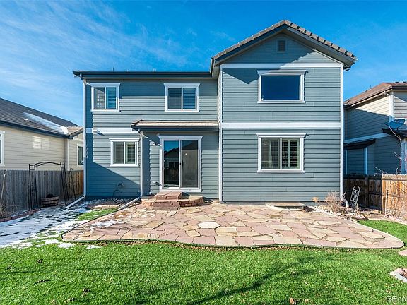 Built in 2013, this Commerce City two-story home offers a fireplace, hardwood flooring, stainless steel appliances, and a two-car garage.